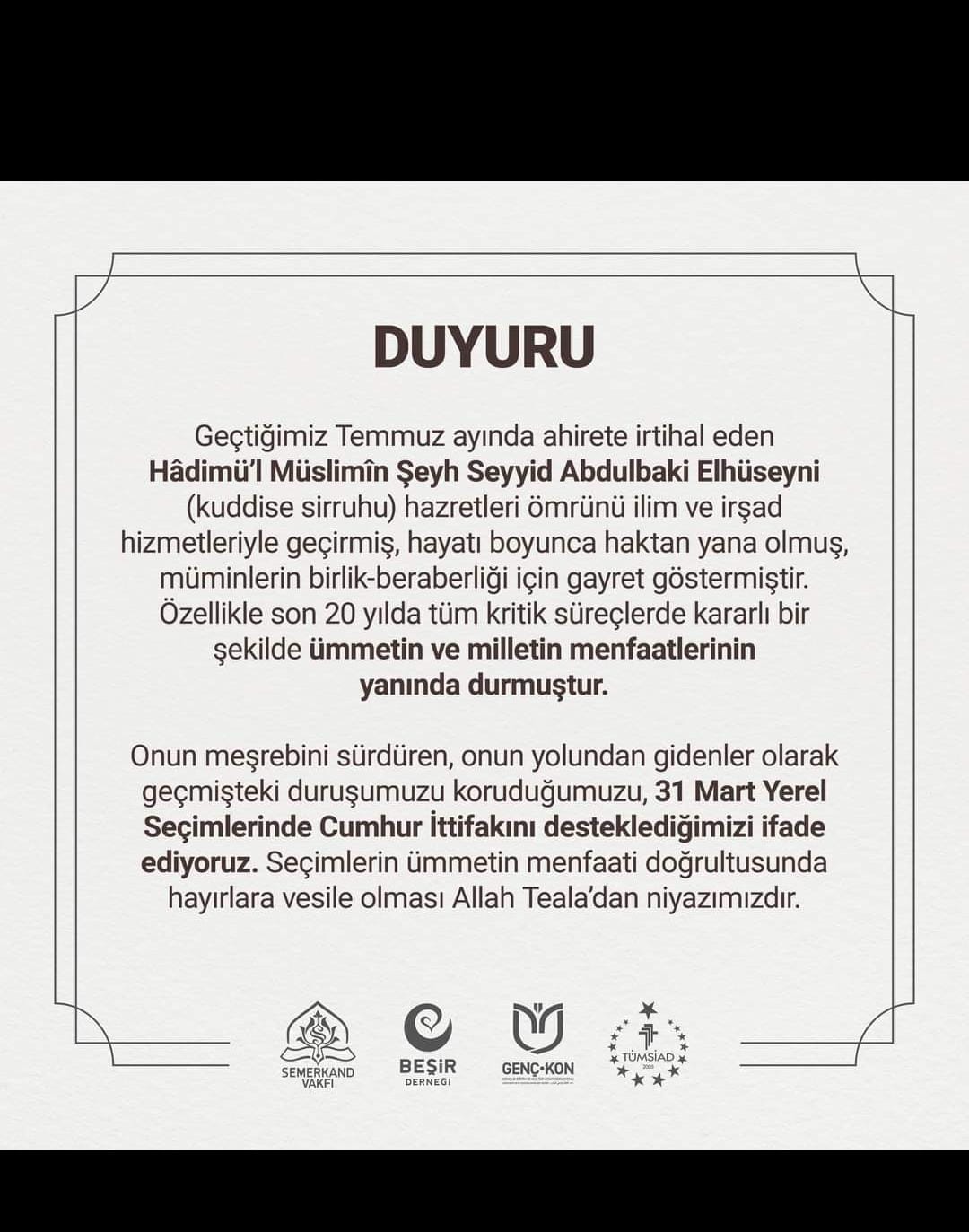 Yapılan paylaşımda Semerkand Vakfı Beşir Derneği Gençkon ve Tümsiad Cumhur ittifakı adaylarını desteklediklerini duyurdu.Yapılan paylaşımda şu ifadelere yer verildi “Geçtiğimiz Temmuz Ayı’nda ahirete irtihal eden Hâdimü’l-Müslimîn Abdülbâki el-Hüseynî (kuddise sirruhu) hazretleri ömrünü, ilim ve irşad hizmetleriyle geçirmişi hayatı boyunca haktan yana olmuş, müminlerin birlik ve beraberliği için gayret göstermiştir. Özellikle son 20 yılda tüm kritik süreçlerde kararlı bir şekilde ümmetin ve milletin menfaatlerinin yanında olmuştur. Onun meşrebini sürdüren, onun yolunda gidenler olarak geçmişteki durumumuzu koruduğumuzu, 31 Mart Yerel Seçimlerinde Cumhur İttifakını desteklediğimizi ifade ediyoruz. Seçimlerin ümmetin menfaati doğrultusunda hayırlara vesile olması Allah Teala’dan niyazımızdır.”