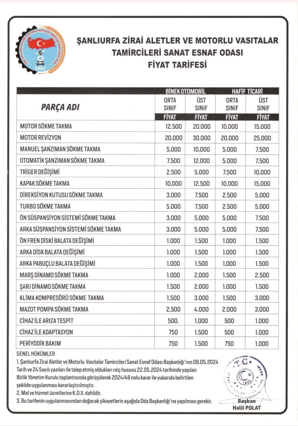 Şanlıurfa Zirai Aletler ve Motorlu vasıtalar tamircileri sanat ve esnaf odası başkanı Halil Polat yaptığı açıklamada;”Kıymetli esnaf ve sanatkar kardeşlerim, değerli müşterilerimiz, sanayi sitemizde iş ve işlemlerin daha şeffaf daha kaliteli ve daha uygun fiyata çıkabilmesi için oda başkanlığımız tarafından fiyat tarifesi yapmış bulunmaktayız.Bu fiyat tarifesi inşaallah şehrimize esnaflarımıza ve siz değerli müşterilerimize hayırlı olmasını diler, bu fiyat tarifesini oda başkanlığımızdan esnaflarımız ücretsiz olarak alabilirler.Rabbim şehrimize esnaflarımıza hayırlı hizmetler yapmayı nasip etsin inşallah.”
