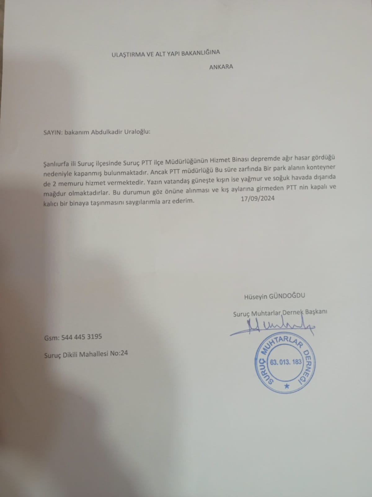 Suruç Dikili Mahallesi Muhtarı ve Suruç Muhtarlar Derneği Başkanı Hüseyin Gündoğdu, Suruç’ta deprem sonrası yaşanan PTT sorunlarını Ulaştırma Bakanlığı’na bir dilekçe ile iletti. Gündoğdu, dilekçesinde depremden sonra hizmet binası ağır hasar gören ve bu nedenle kapanan Suruç PTT Müdürlüğü’nün, geçici olarak bir park alanındaki konteynerde sadece 2 memur ile hizmet verdiğini belirtti.