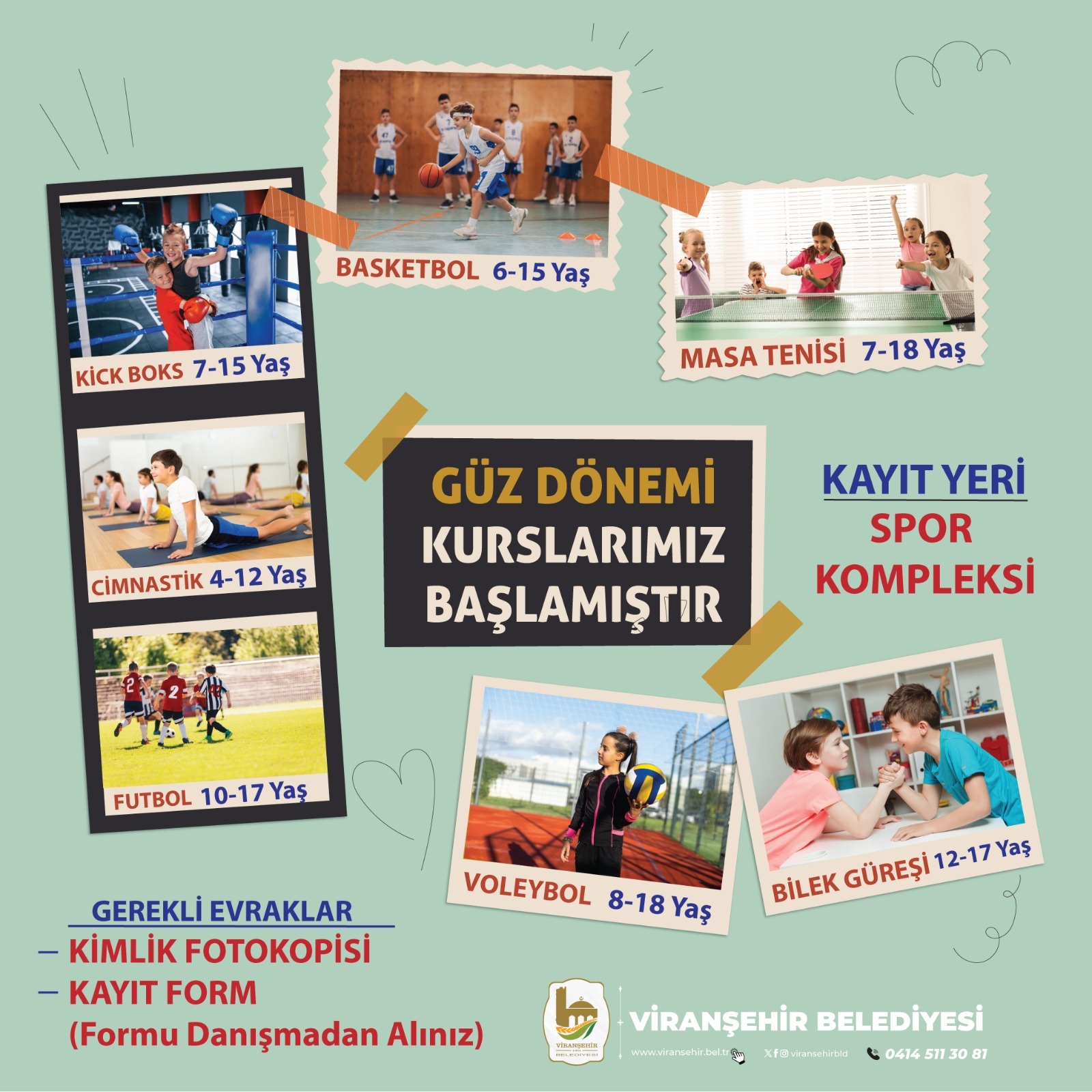 Viranşehir Belediyesi tarafından ilçedeki çocuklar ile gençlerin bedensel ve zihinsel gelişimlerine katkı sağlamak amacıyla, kick boks, futbol, basketbol, voleybol, masa tenisi, cimnastik ve bilek güreşi olmak üzere 7 farklı spor dalında kurs açılacak.