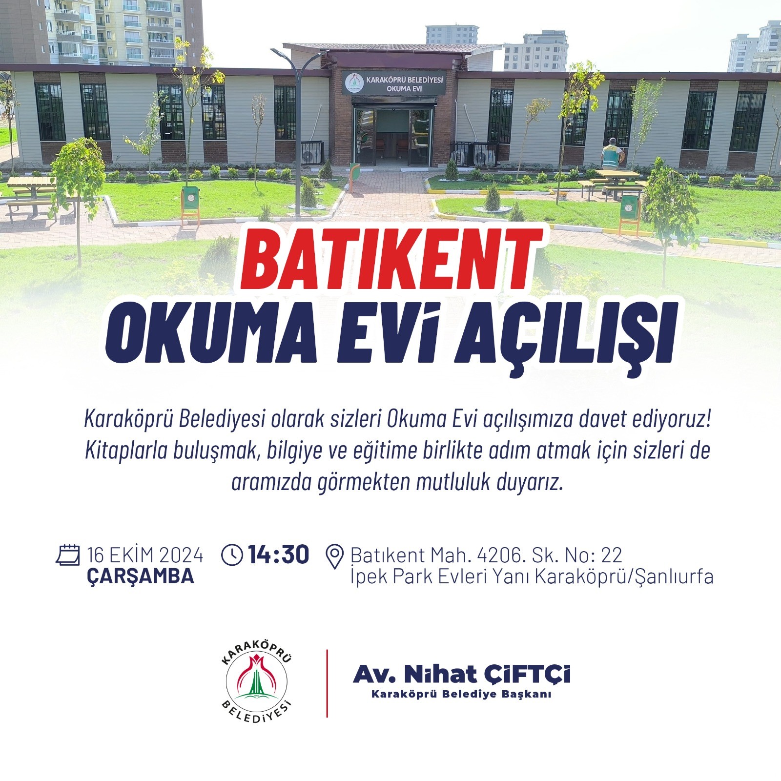 Gençlerin eğitimine katkı sunmak isteyen Karaköprü Belediyesi ilçeye yeni tesisler kazandırmaya devam ediyor. Batıkent Mahallesinde gençlerin sakin ve konforlu bir ortamda ders çalışması için kazandırılan okuma evi açılışa hazırlanıyor.Son hazırlıkların hızla tamamlanan okuma evinin açılışı, 16 Ekim Çarşamba günü Karaköprü Belediye Başkanı Nihat Çiftçi’nin katılımlarıyla gerçekleştirilecek.Gençlerin bu yeni mekândan en iyi şekilde faydalanacağına inandığını ifade eden Başkan Çiftçi, yeni okuma evinin açılışının ilçedeki eğitim imkanlarını artıracağına vurgu yaparak, tüm vatandaşları açılışa davet etti.Batıkent Okuma Evinden aynı anda 100 öğrenci ders çalışabilecek.