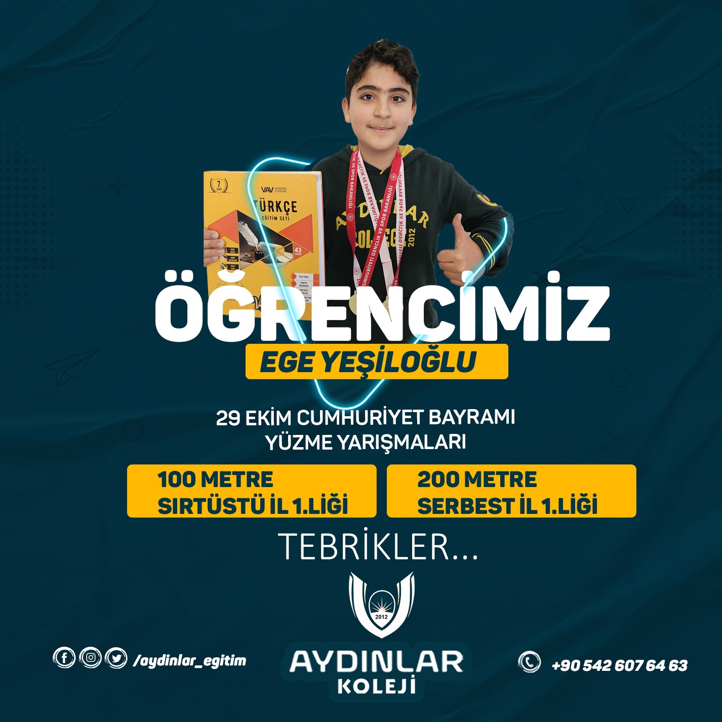 Farklı stil ve mesafelerde yapılan müsabakalarda Aydınlar Koleji Ortaokulu 7. Sınıf öğrencisi Ege Yeşiloğlu 100 Metre Sırtüstü Yüzme kategorisinde il 1.si ve yine 200 Metre Serbest Stil kategorisinde de il 1.si olmuştur. Aydınlar Koleji 7. Sınıf öğrencisi Utku Orhan ise 50 Metre Kelebek Stili Yüzme kategorisinde il 1.si, 100 Metre Kelebek Stili kategorisinde ise il 2.si olmuştur. Başta derece yapan öğrenciler olmak üzere emek veren aileleri, antrenörleri ve öğretmenlerini tebrik ederiz.