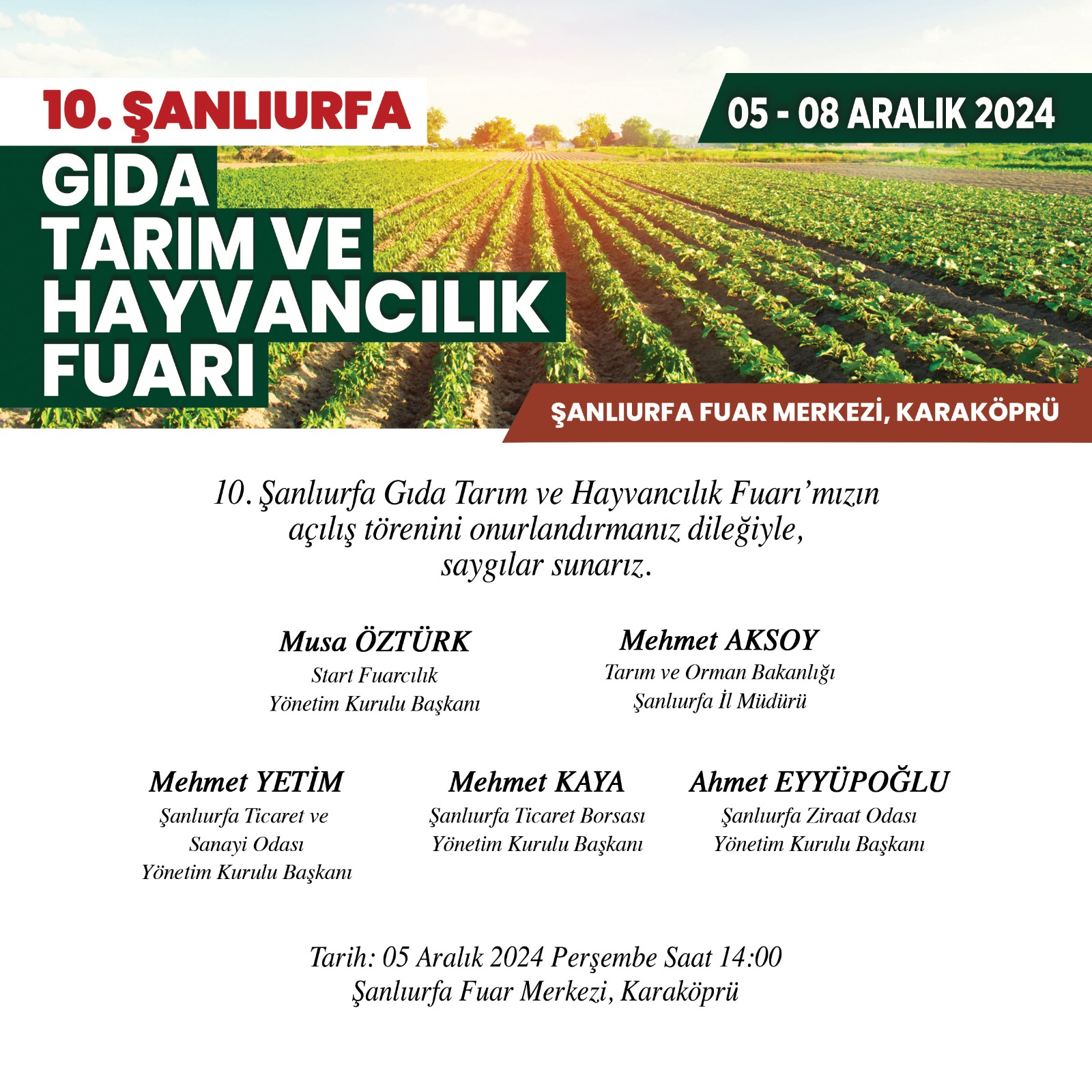 Şanlıurfa’da düzenlenecek 10. Şanlıurfa Gıda Tarım ve Hayvancılık Fuarı, bölgede önemli bir sektör buluşmasına ev sahipliği yapacak, 100 binin üzerinde ilgili ziyaretçiyi ağırlayacakStart Fuarcılık Yönetim Kurulu Başkanı Musa Öztürk, Şanlıurfa Fuar Merkezi’nde 5-8 Aralık’ta yapılacak 10. Şanlıurfa Gıda Tarım ve Hayvancılık Fuarı’nın, Valilik, Büyükşehir Belediye Başkanlığı, Ticaret Odası, Ticaret Borsası, ziraat odaları ve diğer üretici örgütlerinin destekleriyle düzenleneceğini söyledi.