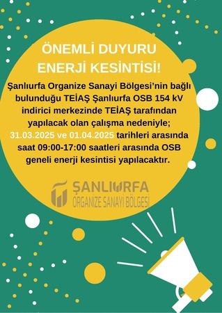 Şanlıurfa Organize Sanayi Bölge ( OSB) Müdürlüğü önemli bir son dakika açıklaması yaptı.Buna göre, OSB’nin bağlı bulunduğu indirici merkezinde yapılacak çalışma nedeniyle 31 Mart ve 1 Nisan tarihlerinde, saat 09.00-17.00 saatleri arasında enerji kesintisi yaşanacak.Konuyla ilgili olarak OSB’den gelen açıklamada şu ifadelere yer verildi:”SANAYİCİLERİMİZİN DİKKATİNE!Şanlıurfa Organize Sanayi Bölgesi’nin bağlı bulunduğu TEİAŞ Şanlıurfa OSB 154 kV indirici merkezinde TEİAŞ tarafından yapılacak olan çalışma nedeniyle; 31.03.2025 ve 01.04.2025 tarihleri arasında saat 09:00 – 17:00 saatleri arasında OSB geneli enerji kesintisi yapılacaktır.”