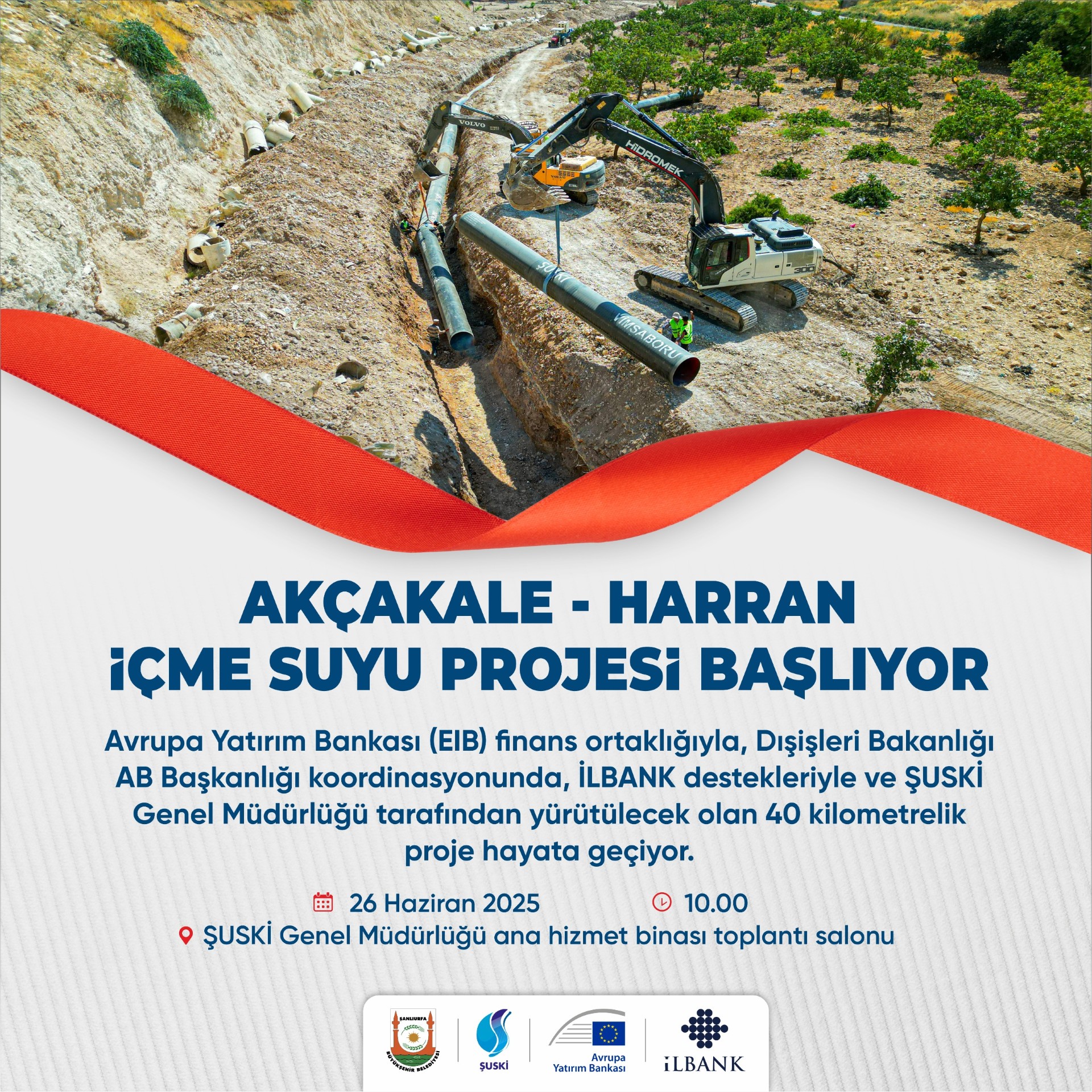 Şanlıurfa’nın su altyapısında tarihi bir adım atılıyor. Şanlıurfa Büyükşehir Belediyesi ŞUSKİ Genel Müdürlüğü’nün öncülüğünde, Avrupa Yatırım Bankası (EIB) finansman ortaklığıyla, Dışişleri Bakanlığı Avrupa Birliği Başkanlığı’nın koordinasyonunda ve İLBANK destekleriyle Akçakale-Harran İçme Suyu Projesi hayata geçiriliyor.