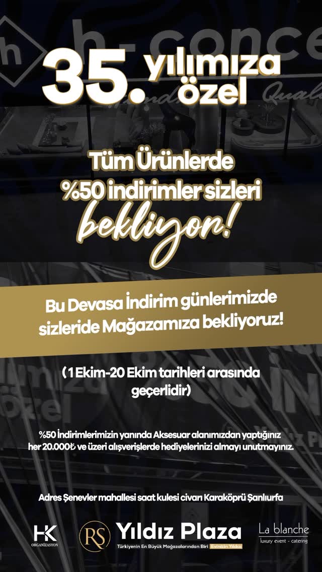 “35 yıldır Şanlıurfa halkının güveniyle büyüdük. Bizim için her müşteri bir dost, her satış bir hatıra demek. Bu nedenle, 35. yılımızda müşterilerimize minnetimizi göstermek adına büyük bir indirim kampanyası hazırladık. Herkesi mağazamıza bekliyoruz.”
