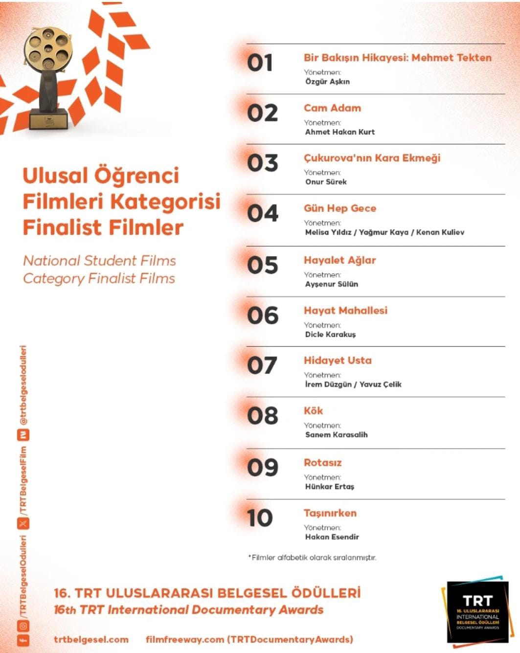 TRT Belgesel Ödülleri 2025’in ödül töreni, 6–9 Kasım tarihleri arasında İstanbul Fişekhane’de gerçekleştirilecek ve TRT Belgesel ekranlarından canlı olarak yayınlanacak.Çocukluğundan bu yana TRT Belgesel’i ilgiyle takip eden Onur Sürek, bu kez finalist olarak aynı sahnede yer almanın büyük heyecanını yaşadığını ifade etti.Genç yönetmen, şu sıralar iki yeni belgesel projesi üzerinde çalışmalarını sürdürüyor.️ Onur Sürek’in “Çukurova’nın Kara Ekmeği” Belgeselinin Finale Kaldığı Festivaller:62. Uluslararası Antalya Altın Portakal Film Festivali16. TRT Belgesel Ödülleri11. TRT Geleceğin İletişimcileri YarışmasıDicle Uluslararası Film FestivaliAmasya Film FestivaliMardin Film Festivali